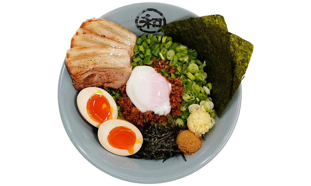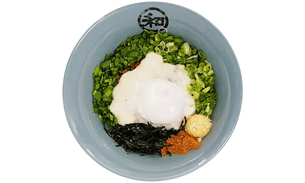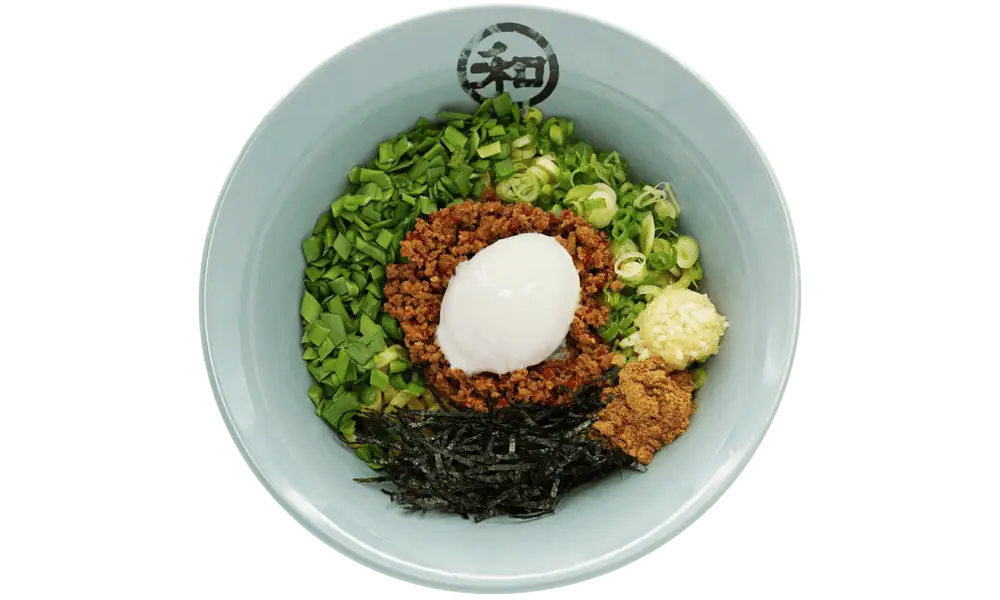 Spicy minced pork|Poached egg|Scallions|Chives|Minced garlic|Fish umami|Seaweed flakes