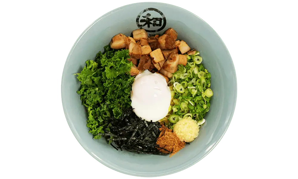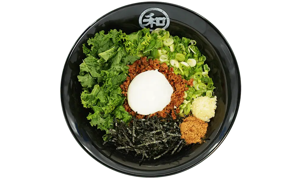 Soy marinated diced chashu|Kale|Poached egg|Scallions|Minced garlic|Fish umami|Seaweed Flakes