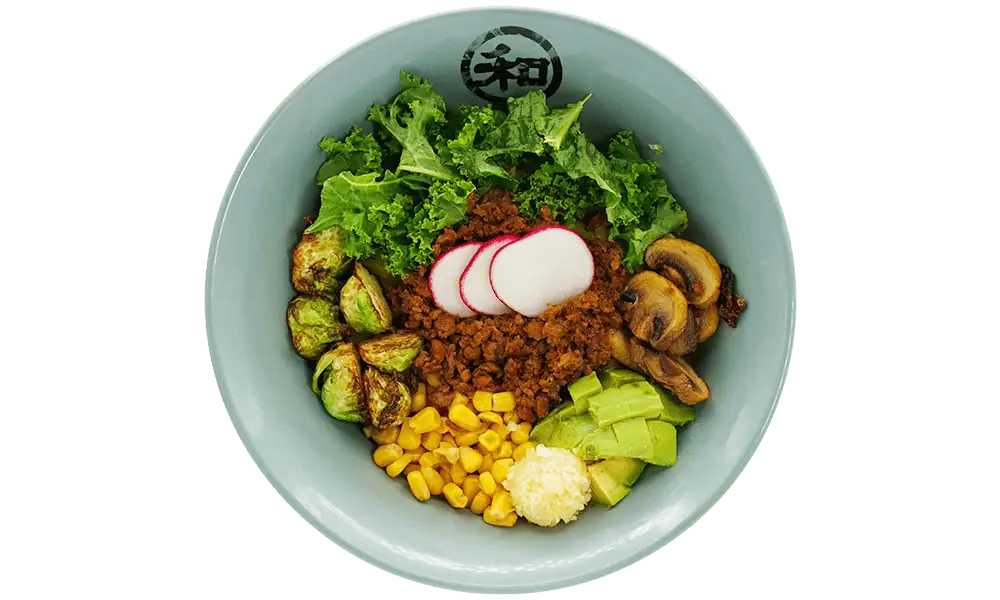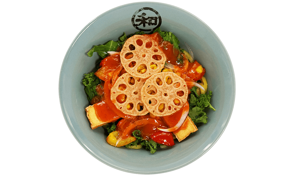 Blended spicy miso|Tofu|Kale|Corn|Sliced red onion|Yellow and red bell peppers|Sliced lotus roots|Fish umami